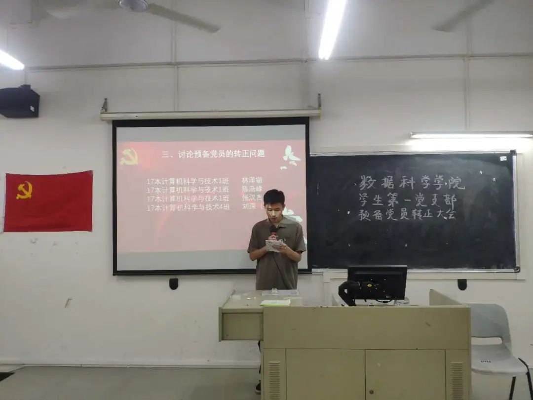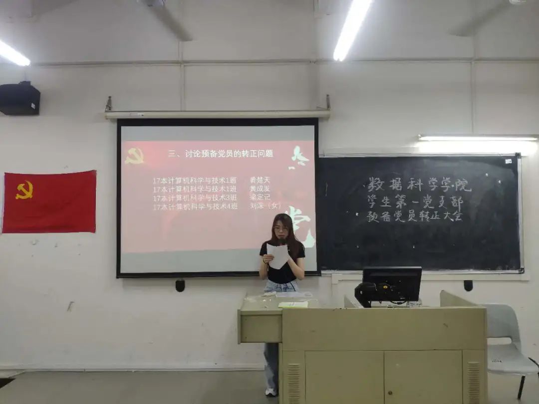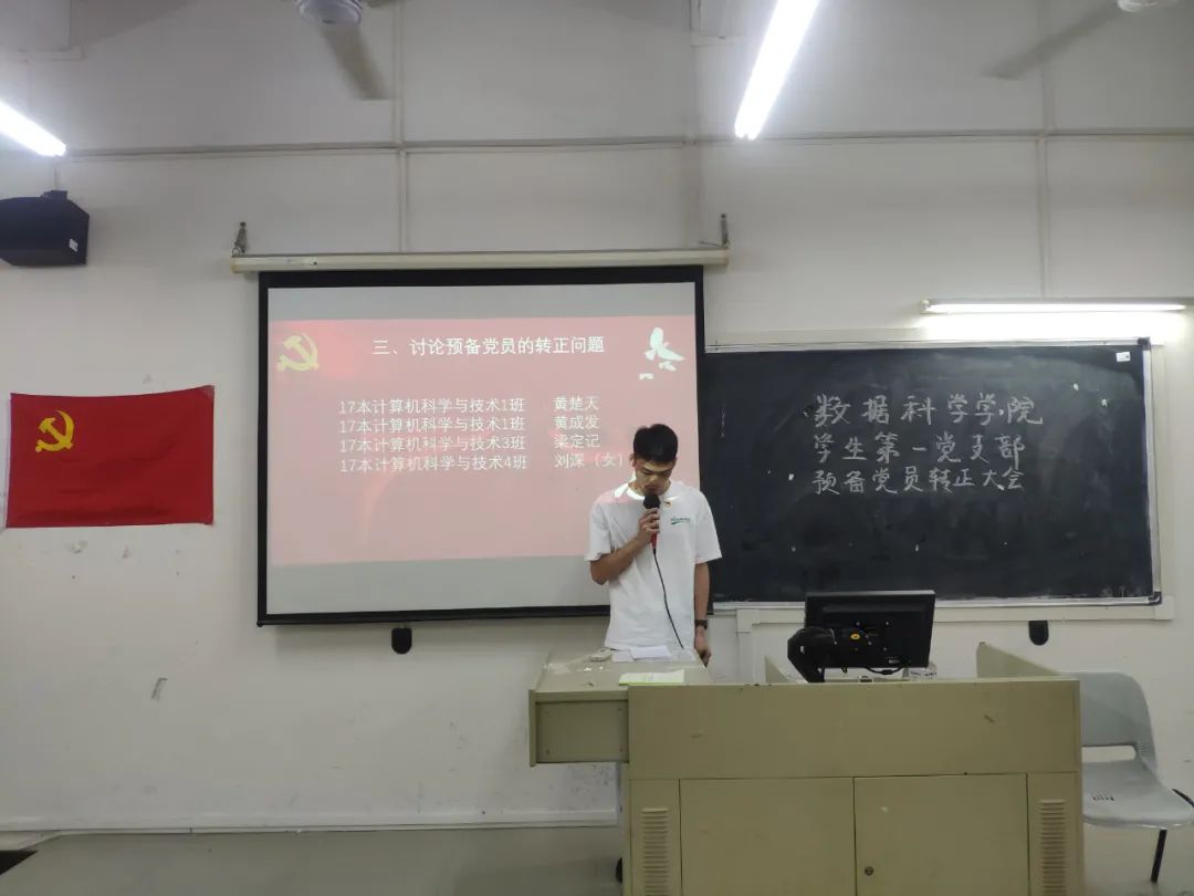 2020年9月9日19:30,数据科学学院学生第一党支部在厚德楼C312教室召开预备党员转正大会,大会由朱选宾同志主持,学生第一党支部书记谢朋涛老师、党支部全体党员参与了本次会议。