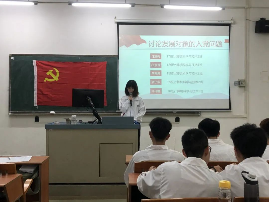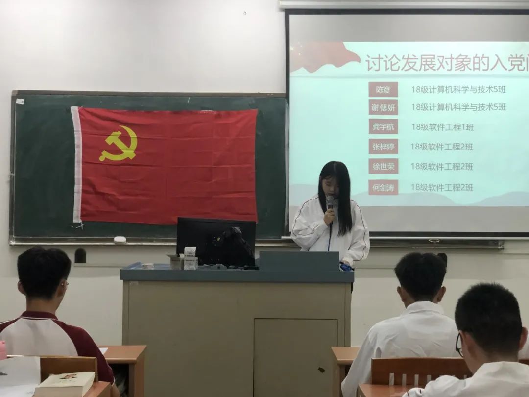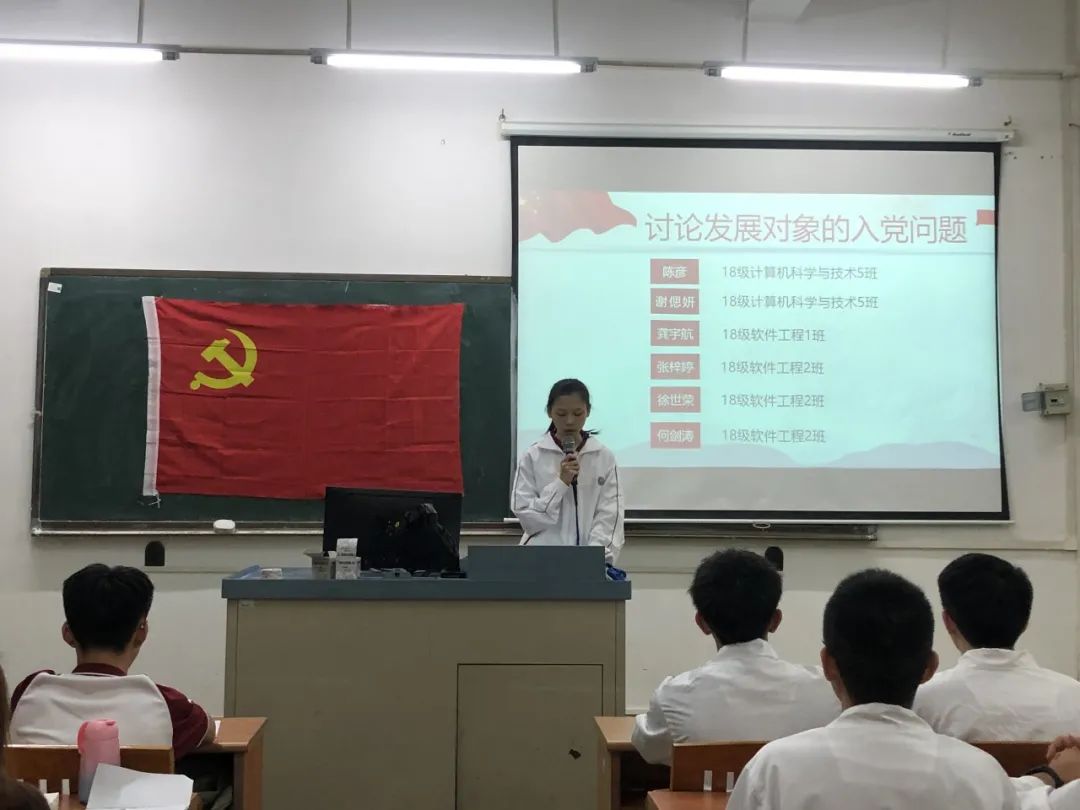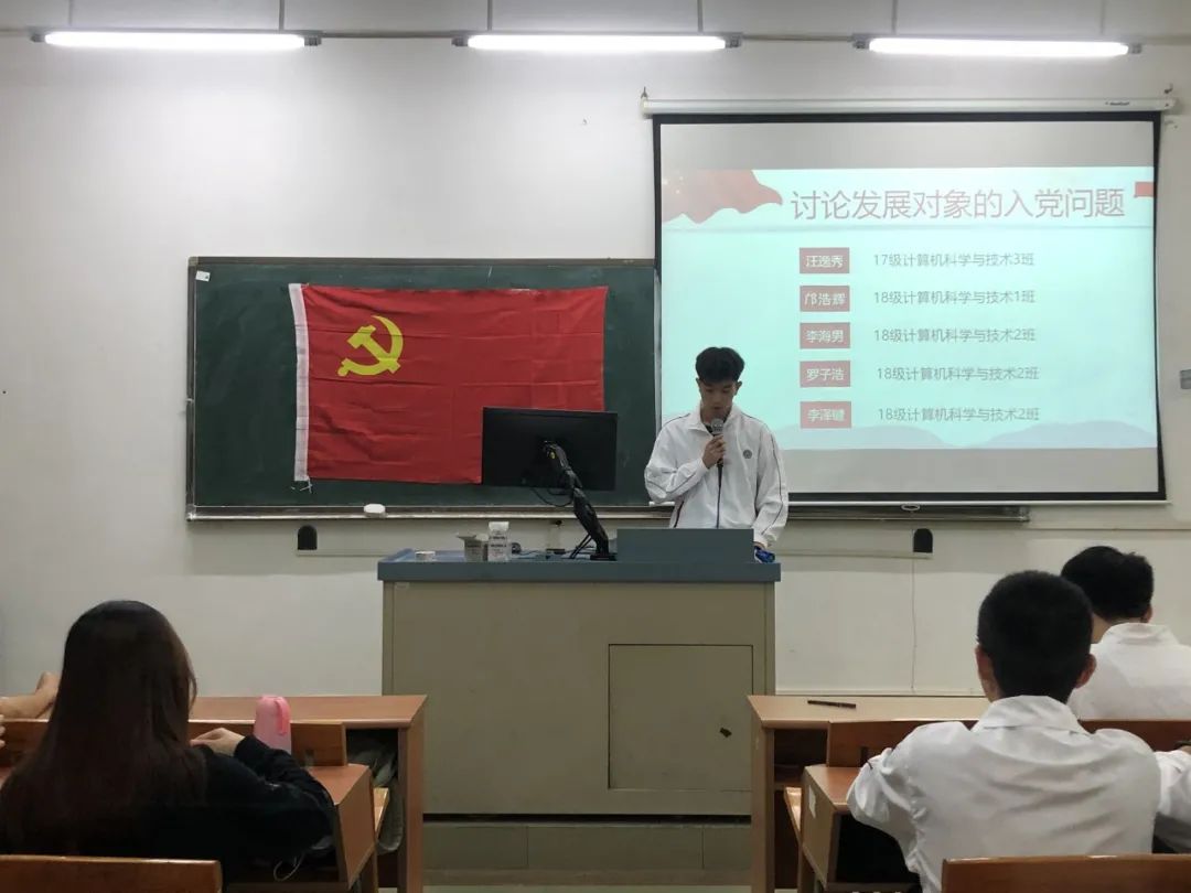 讨论发展对象的入党问题,16名发展对象依次上台宣读入党志愿书,他们将自己的具体信息和生活、学习等情况向党组织进行汇报,表示自己将会以党员的标准来严格要求自己,也希望自己可以在党组织的培养下,不断加强理论知识学习,严格践行党员标准,充分发挥党员的先锋模范作用。随后与会的正式党员讨论发展对象的发展问题,拥有表决权的党员逐一对16名发展对象进行不记名投票表决。经表决,一致同意接收汪逸秀等16名同志为中共预备党员。
