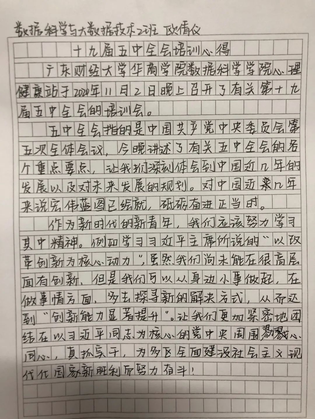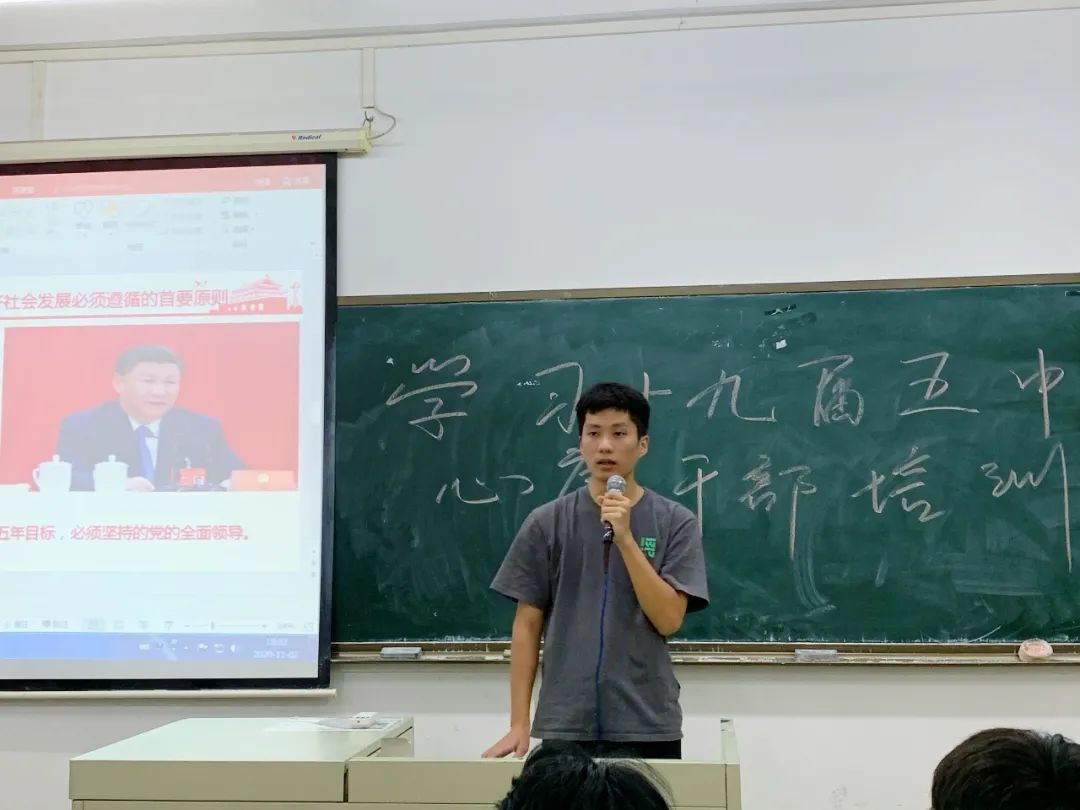 为加强组织干部的思想作风建设,有效地增强组织内团结,保证党的路线、方针、政策和决议的正确贯彻,广东财经大学华商学院数据科学学院心理健康站于2020年11月2日18:00在励志楼C303进行“落笔新答卷,夺取新胜利——深入学习贯彻党的十九届五中全会精神”学生干部培训会。