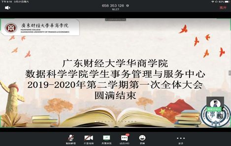 疫情持久,但阻挡不了我们坚守阵地,广东财经大学华商学院数据科学学院“学生事务管理与服务中心”2019—2020学年第二学期第一次全体大会于3月21日20:00在腾讯会议以线上的方式举行。