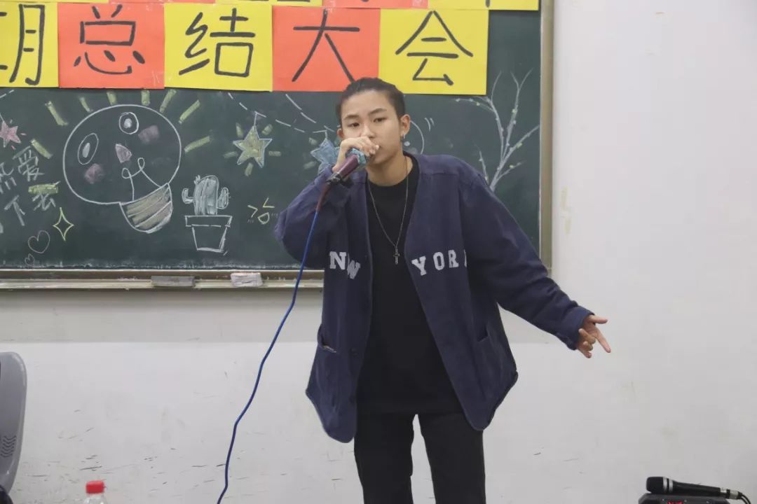 随后是心委才艺表演环节。来自19级电子商务一班的心委陈若轩带来了一段rap表演《场上争霸》,气场max。一段rap将全场的气氛带动起来,场下嘉宾都被这霸气吸引住,纷纷鼓掌叫好。“自古豪杰有万千,沧海横流谱诗篇,古往今来多评论,谁说女子不如男。”女生帅起来男生都要靠边站,新晋rapper闪耀全场光芒。