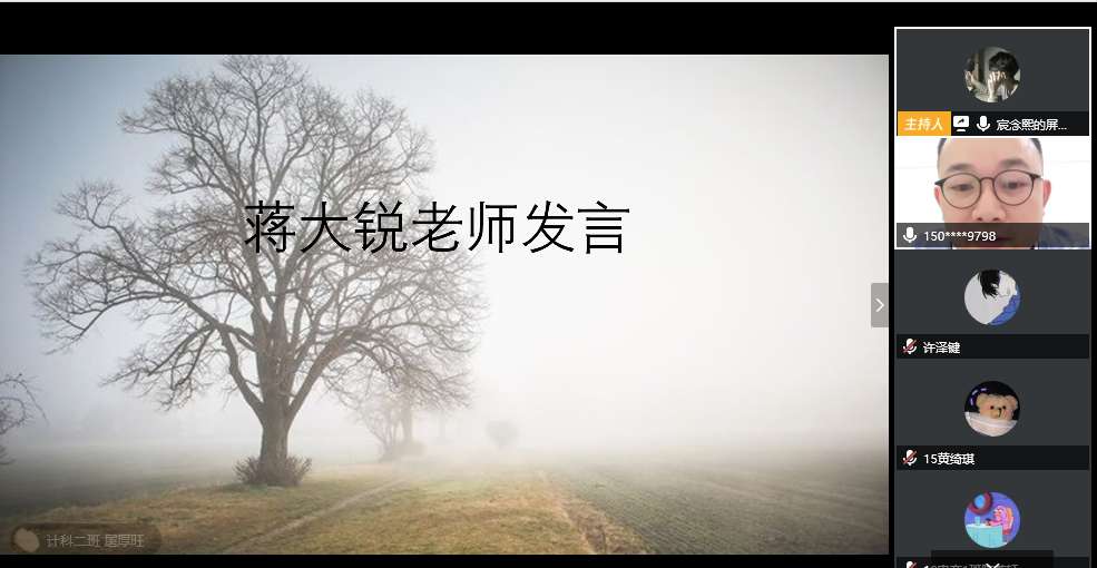 蒋大锐老师用一系列数据向大家讲述了疫情之严峻,影响之广泛,经过全国人民的共同努力,疫情已经得到很好的防控,在此次抗疫中,积极参与的同学展现了青年担当,是当代大学生思想觉悟和爱国奉献的展现。老师提出,同学们在家上网课期间,要注意劳逸结合,既要自律自觉,还要注意身心放松,各班心理委员要关注同学们的心理动态,做好心理反馈。