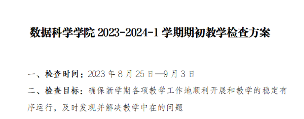 新学期伊始,为进一步规范教学管理,全面掌握教学运行状况,确保新学期课堂教学工作正常、有序地开展。根据学院学期初教学检查方案总体部署,8月28日,数据科学学院常务副院长赖庆,数据科学学院党委副书记、学院副院长蒋大锐、全体辅导员以及部分专任老师深入教学一线,检查新学期开课师生们的精神面貌和课堂教学开展情况。