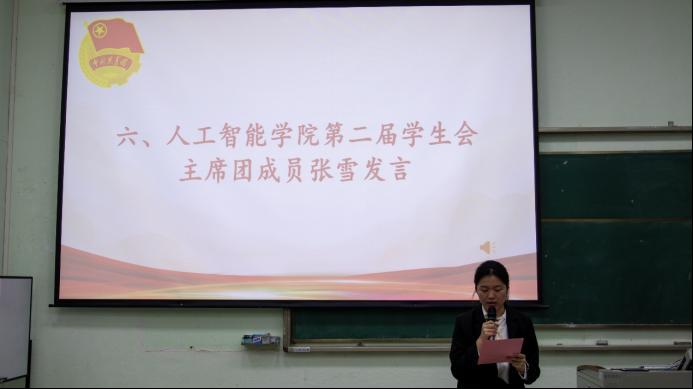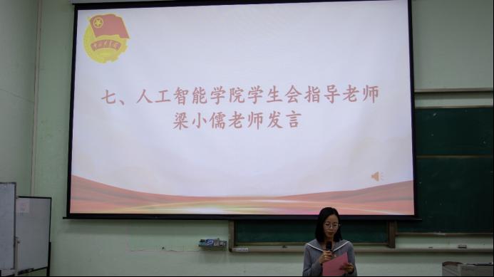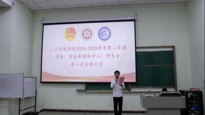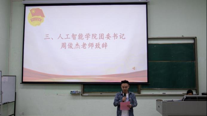 周俊杰老师向辛勤付出的全体学生干部致谢,并结合学院专业特色提出三点工作要求:一是方向要对、思想要正,坚守学生干部初心,传播正能量,将个人成长与国家发展相结合;二是多办实事、服务同学,深入同学群体,倾听需求,让团学组织成为同学们信赖的依靠;三是敢想敢试、特色赋能,发挥AI专业优势,创新活动形式与宣传方式,打造学院特色团学品牌。