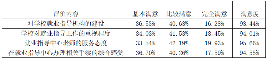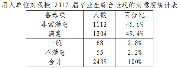 根据我校对 2017 届毕业生开展的就业满意度调查,毕业生对目前工作感到很满意的比例为 6.19%,较满意的为 52.93%,基本满意的为26.65%,就业满意度合计 85.77%。