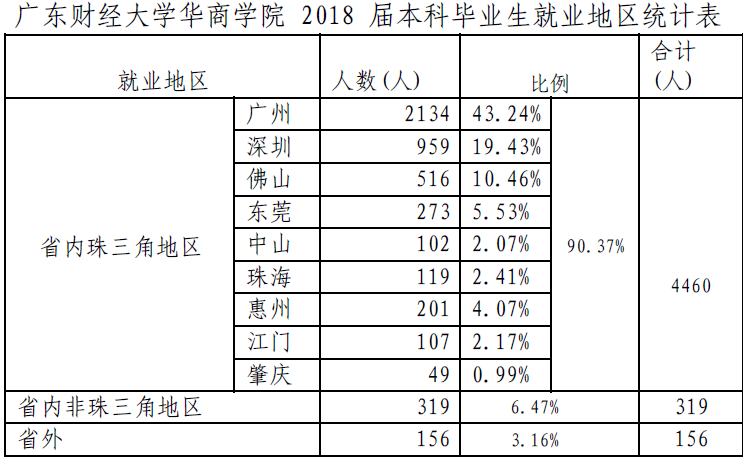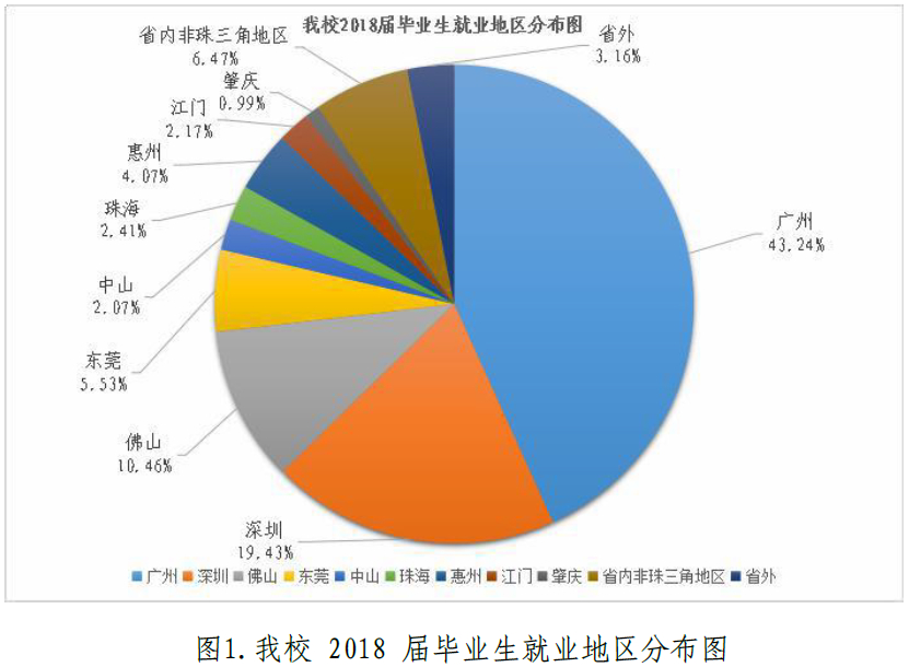 截至 2018 年 9 月 1 日止,我校 2018 届已就业本科毕业生总数为4935 人,其中在珠三角地区就业的有 4460 人,占已就业本科生人数的90.37%;在省内珠三角地区以外的有 319 人,占全校已就业本科生人数6.47% ;在外省就业的有 156 人,占全校已就业本科生人数3.16% . 详情请参看下表和图 1。
