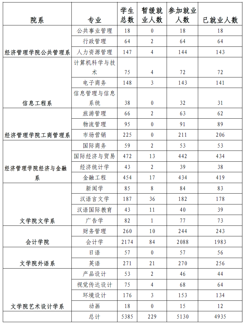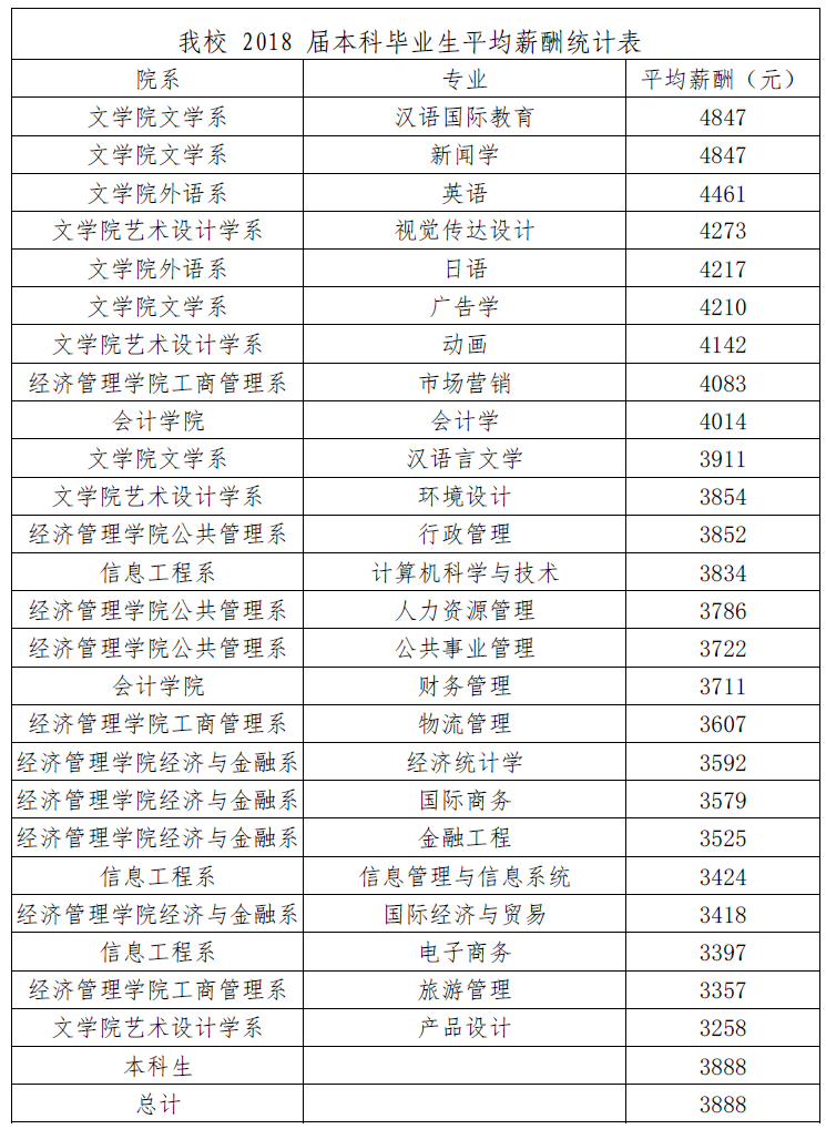 大学生就业在线院校应用系统中的数据显示,我校2018 年毕业生的平均薪酬约为3888元,其中最高的是汉语国际教育和新闻学专业,平均薪酬 4847 元;其次是英语,为 4461 元;再次是视觉传达设计,为 4273 元。因为此项数据统计时间刚好为毕业生入职的实习期或者试用期,数据显示为毕业生的入职工资,比毕业生实际薪酬低。