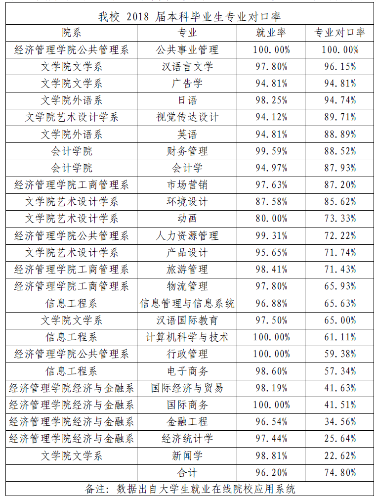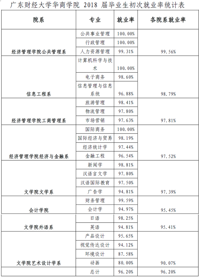 根据广东省教育厅粤教毕函【2018】34 号文,2018 年全省共有 54.26 万名高校应届毕业生,截止2018 年 9 月 1 日,我省 2018 年普通高等学校毕业生初次就业率为94.18%(其中研究生为93.52%,本科生为93.84%,专科生为94.56%)。我校 2018 届毕业生(均为本科)初次就业率为 96.20%,高于全省的平均水平。