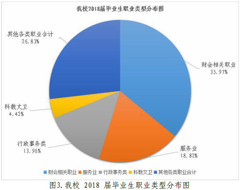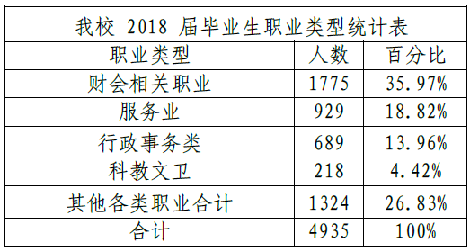 从职业类型分布来看,我校2018 届毕业生的职业类型,比例最高的为财会相关职业,占 35.97%;其次是其他各类职业,占 26.83%;再次是服务业,占 18.82%,行政事务类占 13.96%,科教文卫类职业占4.42%。