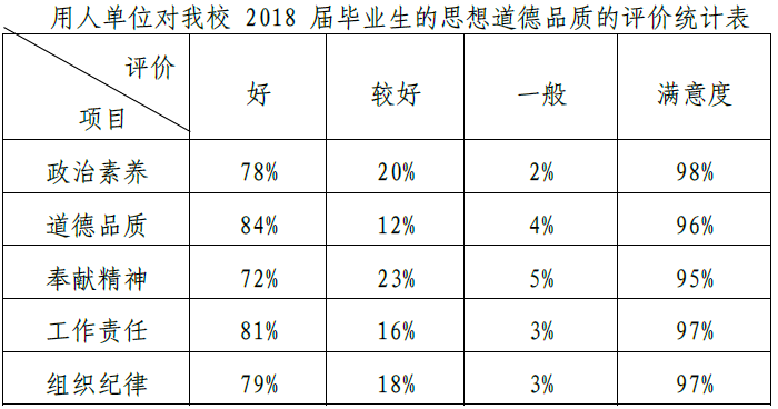 用人单位对我校毕业生各方面评价均比较高:政治素养、道德品质、奉献精神、工作责任、组织纪律等满意度均在 95%以上,请参看下表。