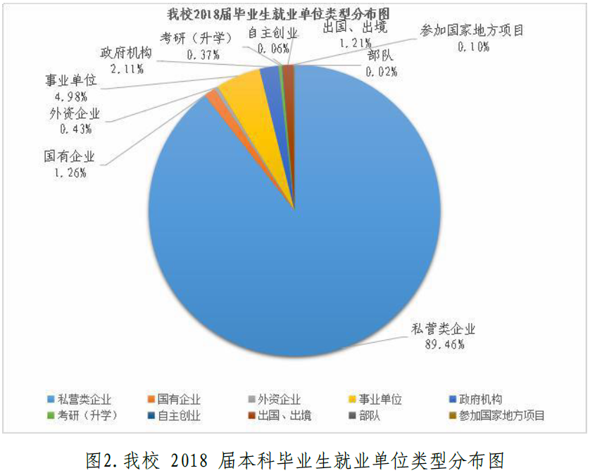 我校人才培养的目标是为广东中小企业及社会服务机构培养理论基础厚,实践能力强、综合素质高的高级应用型人才。从就业流向来看,我校 2018 届毕业生主要集中在私营类企业就业,这与我校的人才培养目标基本一致。我校的就业单位类型统计情况请参看以下表和图 2。