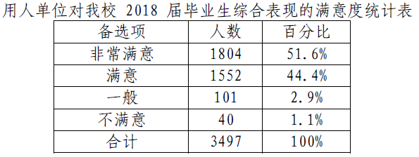用人单位对我校毕业生综合表现非常满意为51.6% ,满意为44.4%,满意度合计 96%,这说明我校毕业生的综合素质得到用人单位的认可,反映出我校教学质量良好。