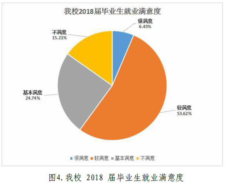 根据我校对 2018 届毕业生开展的就业满意度调查,毕业生对目前工作感到很满意的比例为 6.43%,较满意的为 53.62%,基本满意的为24.74%,就业满意度合计 84.79%。
