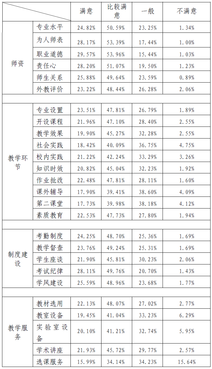 此次调查发出毕业生作答问卷5130 份,回收问卷 4617 份,取其中 3497 份问卷进行统计和数据分析。结果显示,毕业生对我校教学中的师资、教学环节、制度建设、教学服务等方面的满意度较高,对我校的教学效果也较为认可。