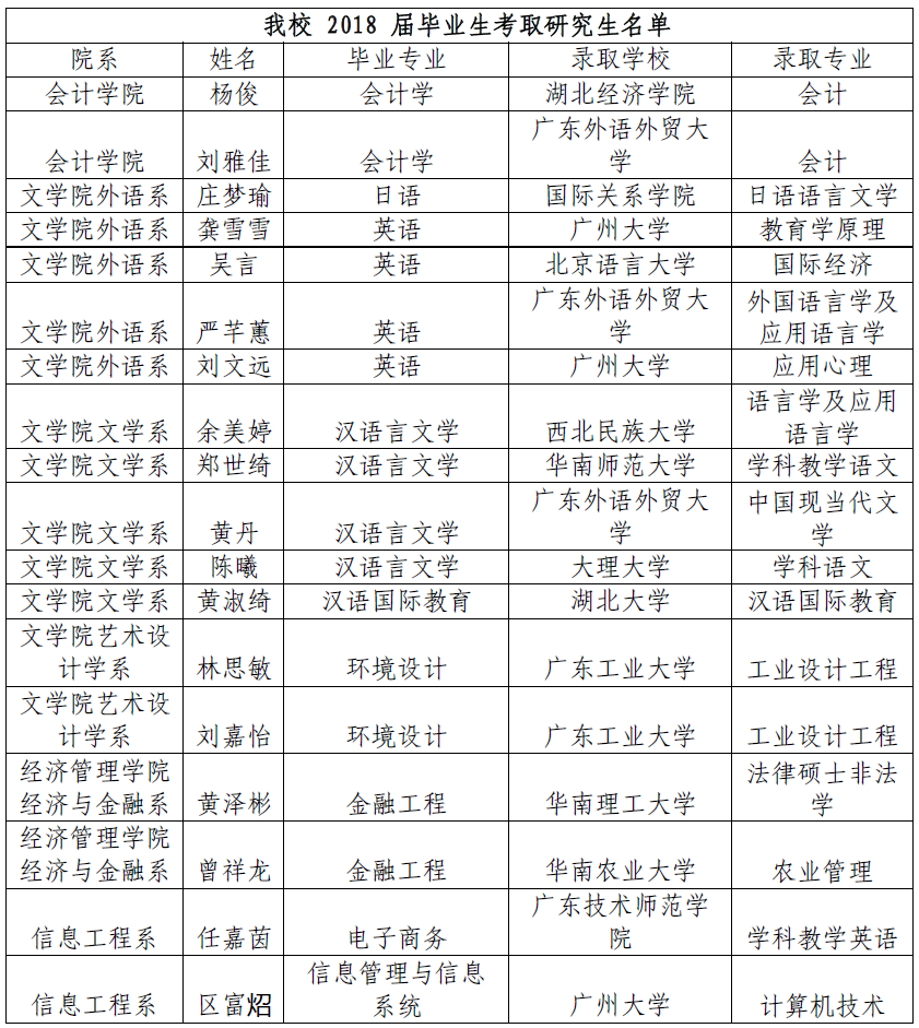 我校鼓励毕业生参加研究生入学考试,提高学历层次,谋求更长远发展。2018 年我校毕业生考取研究生共 18 人,名单如下: