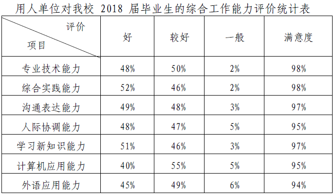 用人单位对我校本科毕业生专业技术能力、综合实践能力、沟通表达能力、人际协调能力、学习新知识能力、计算机应用能力、外语应用能力等的满意度都比较高。总的来说,用人单位对我校毕业生能力综合评价的满意度合计 96.3%,请参看下表。