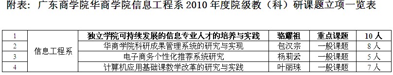 热点新闻 当前位置: 首页 >> 正文 关于广东商学院华商学院信息工程系2010年度院级教(科)研课题立项名单公示的通告 2014-11-19 根据《广东商学院华商学院院级研究课题立项和评审管理办法》的有关规定,经学院教学指导委员讨论通过,现将广东商学院华商学院信息工程系2010年院级教(科)研课题立项名单予以公示,公开接受全院教职工监督,现将有关事项通告如下: 一、公示名单见附表 二、公示时间为2010年10月29日至11月2日 三、立项人员的申报材料在教务处学籍科内展示 四、对立项事宜持异议者,请于11月2日前以书面形式并署真实姓名向教务处反映。反映问题需实事求事,公正准确 五、受理电话:教务处学籍科:020-82666777 上一条:信息工程系与外语系联谊完满落幕 下一条:我系成功举办职业技能培训与职业规划的讲座 【关闭】