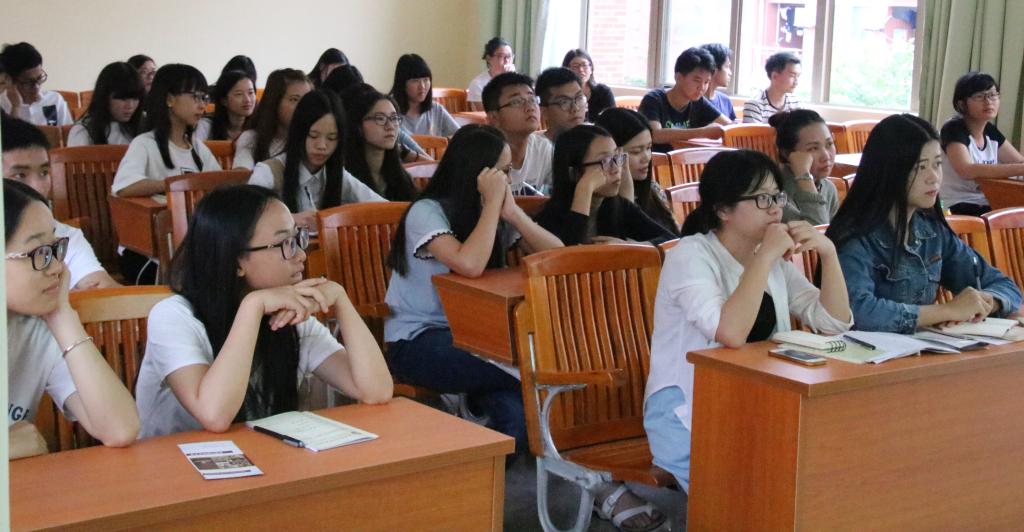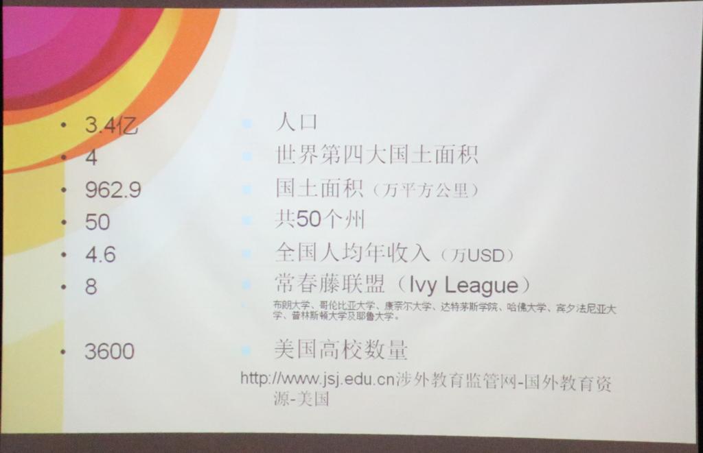 Clair一开始就以轻松幽默的口吻向同学们介绍美国的特色文化,利用一系列具体数据使同学们加深对美国的了解。吸引同学们的兴趣后,Clair用鲜明的例子向同学们阐述留学美国的优势,如良好的签证形势、公平的奖助学金制度等;同时她还通过大量的图片、数据等资料详尽的介绍美国的教育体制和留学生活,让同学们更加全面地了解赴美留学的概况。随后Clair还向同学们具体介绍了留学费用及毕业生工作去向、薪资等与同学们息息相关的问题,至此,同学们对留学美国已有一个大致了解。