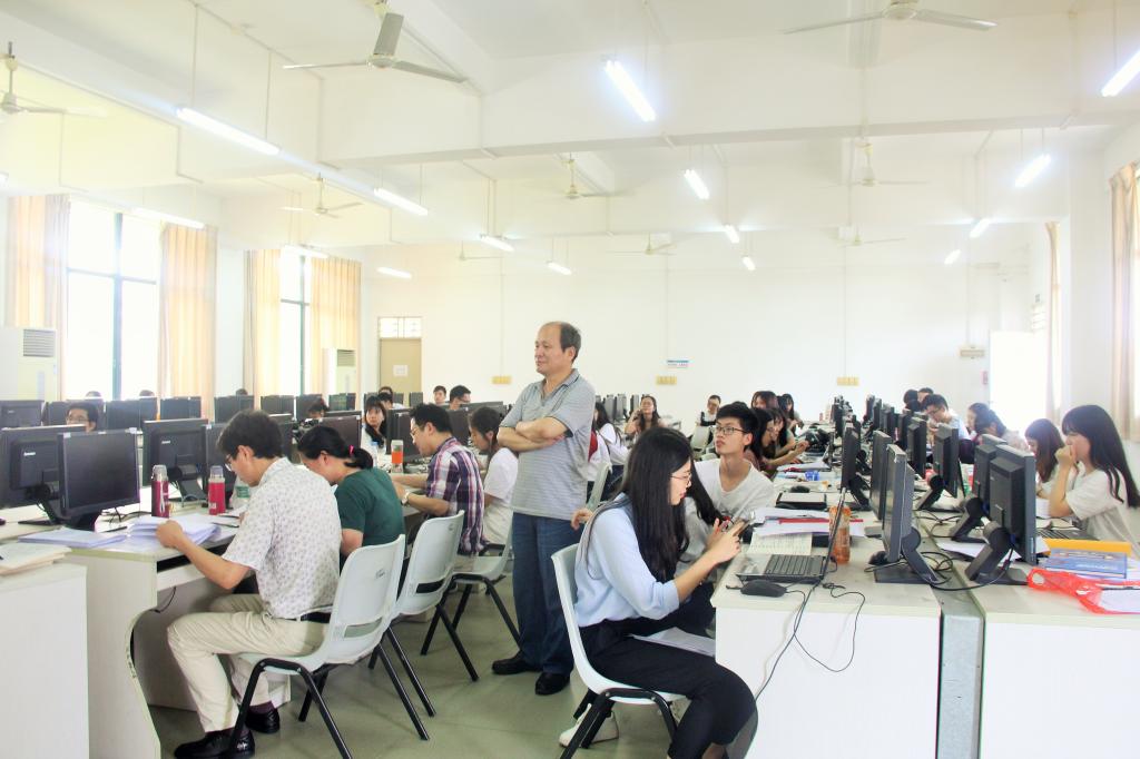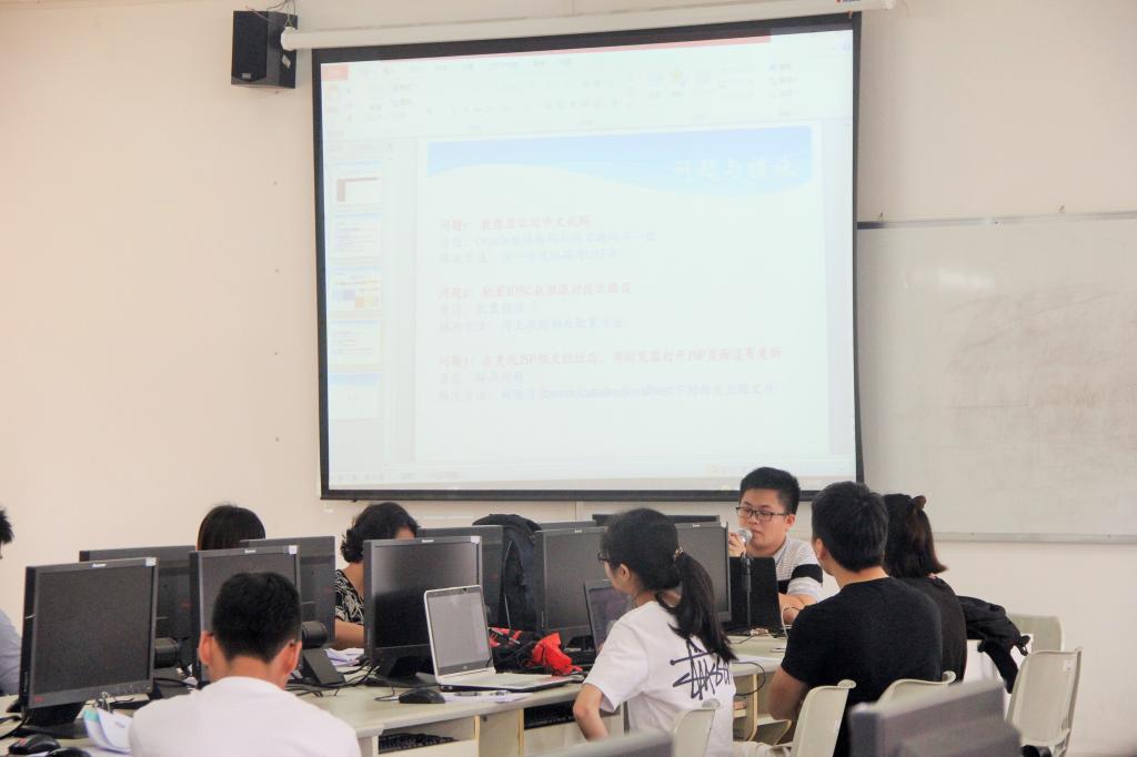 在厚德楼A202及A203进行的是2013级计算机科学与技术专业的毕业生论文答辩。在工作人员的配合下,答辩在紧张的氛围中有序展开,同学纷纷展示自己所设计的系统并加以简洁的语言向老师演示与解说,精彩的展示吸引了不少2014级与2015级的学生前来观摩,而老师们亦结合现实与操作上系统的缺陷给予精准的点评。