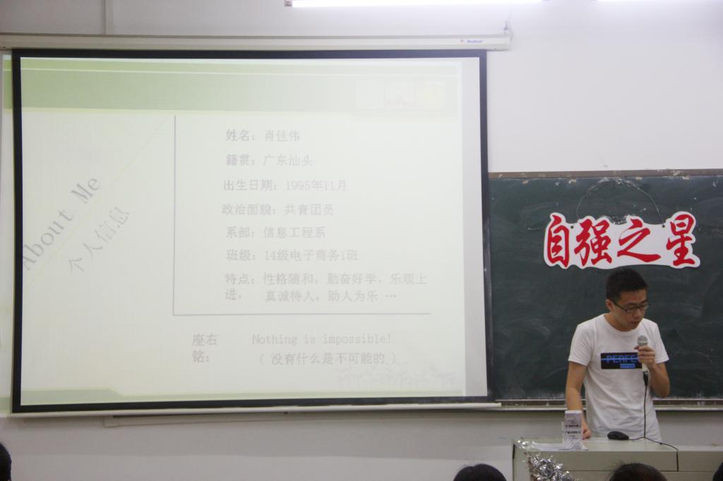 为响应国家精准资助、立德树人的号召,资助部分家庭经济特别困难的优秀学生,鼓励他们自强自立,树立励志典型和榜样模范作用,我系于2017年5月9日晚上七点整在励志楼C205开展“自强之星”演讲活动。本次活动有幸邀请到系党总支副书记、学工副主任蒋大锐老师,系学生事务管理与服务中心指导老师丁伟,系心理健康站副站长魏颖和彭艳君,系学生事务管理与服务中心主任貌路娣以及系学生事务管理与服务中心副主任安丽思等嘉宾。