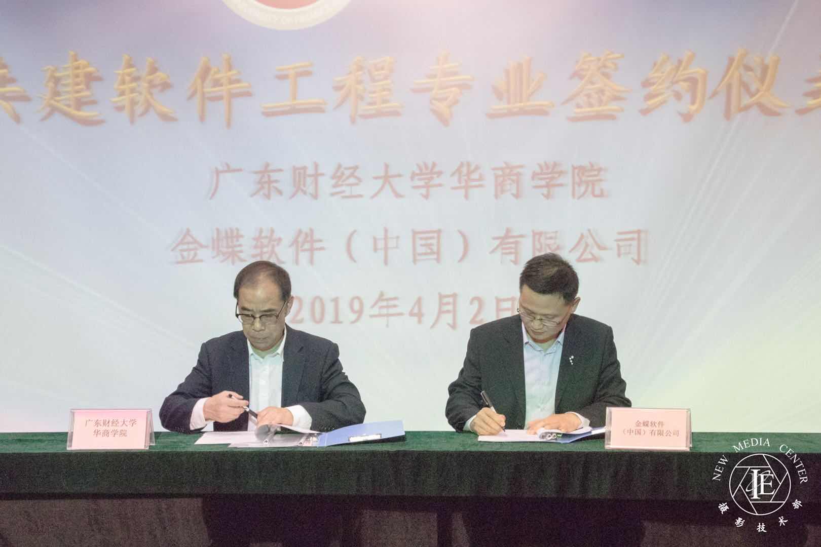 2019年4月2日下午,广东财经大学华商学院与金蝶软件(中国)有限公司在我校图书馆报告厅举办共建软件工程专业框架协议签约仪式。广东财经大学华商学院郭银华执行校长,韩兆洲副校长,金蝶精一信息科技服务有限公司总经理陈跃先生,广东省区总经理魏佳丹先生,广州分公司企业互联网事业部副总监兼技术总监张衍松先生,信息工程系赖庆主任,教务处汪丹副处长等领导嘉宾出席签约仪式,签约仪式由赖庆主任主持。