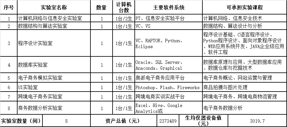 已拥有可支持电子商务实践教学的电子商务运营实验室、电子商务平台开发实验室、信息安全实验室(网络实验室)等总面积超过780平米,资产总值超过237.3489万元。