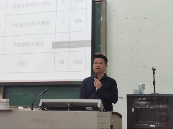 随后,叶仕通副院长汇报了教学工作,包括试卷抽查、毕业论文检查、教学文档规范等。他通报了试卷抽查结果,也指出了统分错误、材料不规范等问题,并希望教师们认真整改。同时,叶副院长还强调了毕业论文的重要性,要求教师们及时进行整改。在教学文档规范方面,他强调了教学大纲、进度表、教案等文档的规范性,要求教师们认真学习新出台的规范文件,以确保教学文档的完整性和准确性。