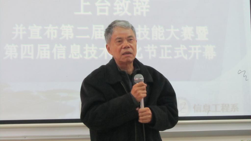 而后,参赛代表上台发言并宣誓:参赛者将遵守比赛规则,诚信认真地进行竞赛。接着骆耀祖主任讲话指出,知识的牢固和设计的创新是非常重要的,学生应该要在学好知识的基础上,巧妙应用,提高专业的敏感性,即善于从身边事物联想到自己的专业知识。最后,骆耀祖主任宣布:“我系第二届专业技能大赛暨第四届信息技术文化节正式开幕!”