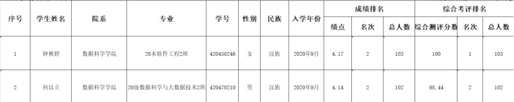 数据科学学院本着“公平、公开、公正、择优”的原则,在广泛宣传基础上,经学生本人申请,班级评议、年级推荐,学院国家奖学金评定小组审核、评议,我院决定拟推荐钟秋婷、何以立参加学校国家奖学金评选,现给予公示。