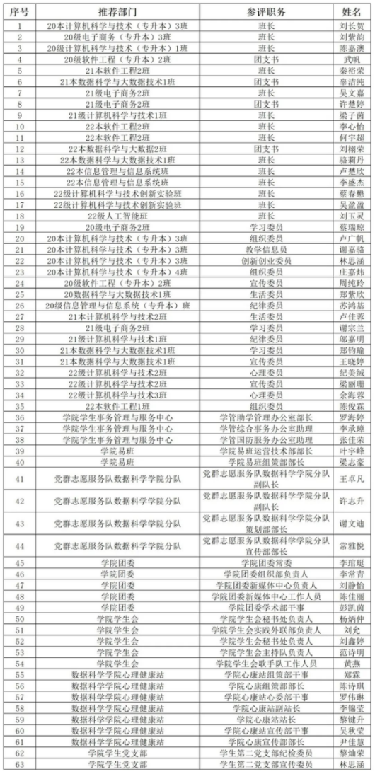 本着“公平、公正、公开”的原则,2023年9月-10月份数据科学学院开展2022-2023学年综合测评相关工作,经学生本人申请、班级测评小组审核、学生事务管理与服务中心综合事务办公室核实、整理汇总,二级测评小组复核,学院领导确认,拟推荐刘长贺等63人获校优秀学生干部奖励。
