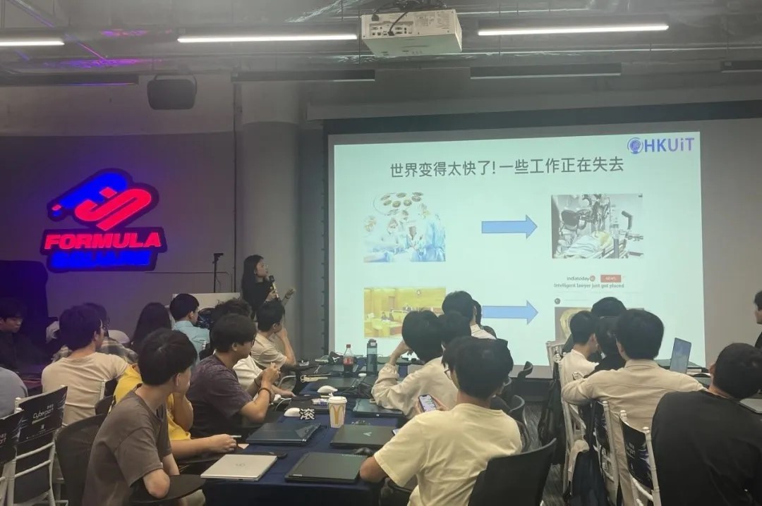 第一站我们来到了香港中文大学深圳研究院。在这里我们上了研学的第一堂课。听主讲人AI阿波为我们讲述Midjourney的使用教程,这是专门为初学者设计的AI软件入门课程,通过实践操作让学生了解和掌握人工智能的基本概念和应用。一个半小时的课时说长不长说短不短却让同学们都受益匪浅。