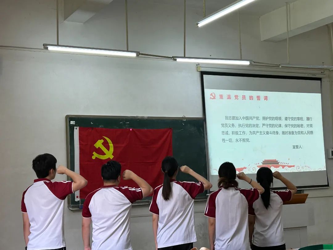 转正党员在林柽莼同志的带领下,进行入党宣誓。面对鲜红的党旗,他们庄严举起右手宣誓,以饱满的激情和铿锵有力的声音表达身为共产党员的自豪感和使命感