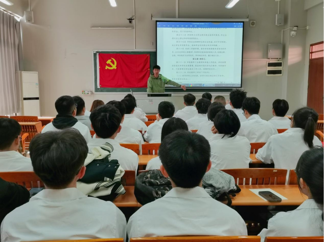 谢嘉希书记主要围绕学校的校训、校徽、校旗等进行了详细的讲解,包括学校的办学性质、办学宗旨、发展目标,学习了校训“厚德、励志、博学、创新”的内涵,并结合《伟德国际victor1946章程》中与学生密切相关的内容进行了重点介绍,使全体党员同志进一步明确自己享有的权利和该履行的义务,充分认识学校章程的重要作用,增强遵守、贯彻学校章程的自觉性。