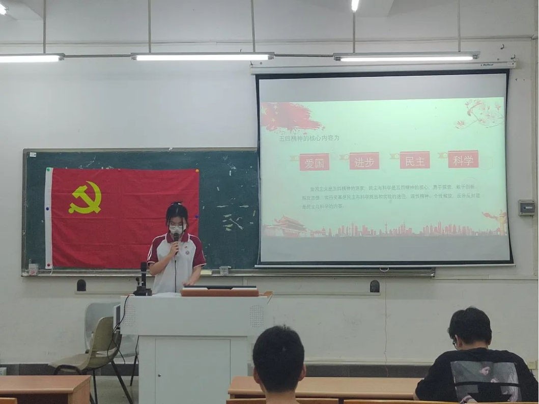 许楚婷同志首先带领参会人员学习了五四精神的核心内容和五四运动的历史意义。五四精神的核心内容为“爱国、进步、民主、科学”。爱国主义是五四精神的源泉,民主与科学是五四精神的核心,勇于探索、敢于创新、解放思想、实行变革是民主与科学提出和实现的途径,理性精神、个性解放、反帝反封建是民主与科学的内容。历史指出:五四运动是20世纪初叶中国历史发展上一件具有划时代意义的重大事件,对20世纪中国的政治、文化、思想,乃至社会生活都产生了极其深远的影响。