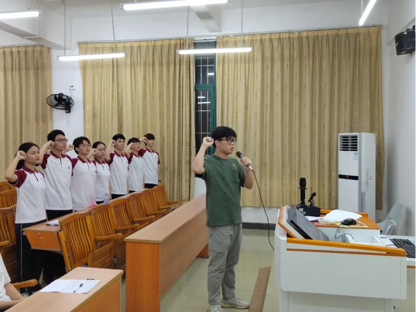 转正党员在主持人陈炽堃的带领下,面对着鲜红的党旗严肃而坚定地重温入党誓词,怀揣着对党的向往与忠诚,宣誓在成为一名正式党员之后,也会继续以奋进践初心,以实干显担当,为党的事业增光添彩。