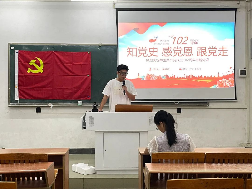 今年是中国共产党成立的102周年,为强化党员教育,推进学生党员了解掌握、感悟铭记中国共产党百年奋斗的光辉历程和其中蕴含的精神力量,数据科学学院学生第一党支部于2023年8月28日在励志楼D102开展“知党史、感党恩、跟党走”专题党课,出席本次会议的有数据科学学院学生第一党支部全体在校党员。本次会议由数据科学学院学生第一党支部书记裴祖君老师主持。