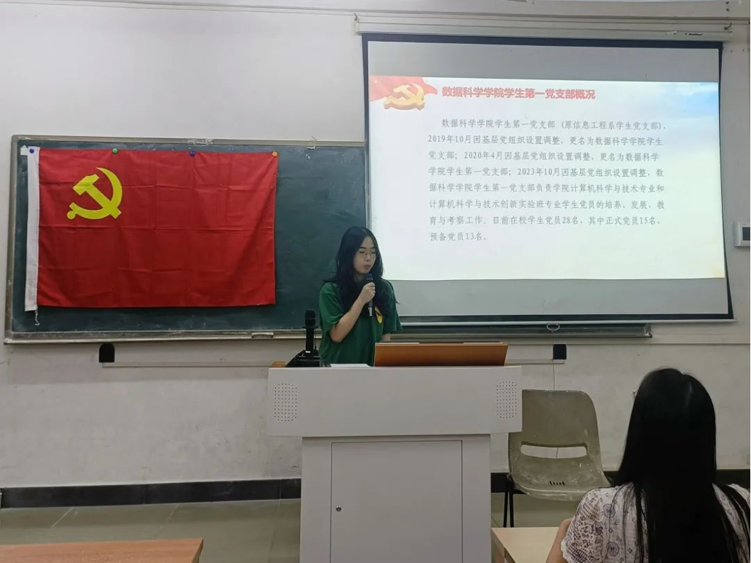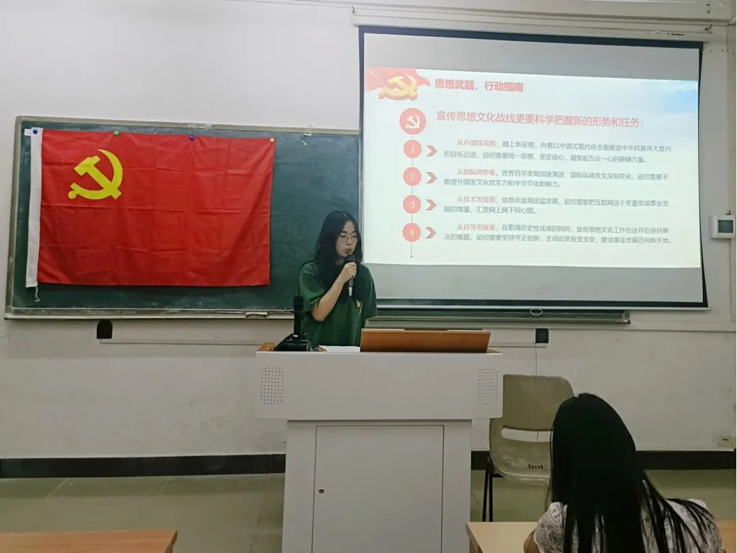 文明生生不息,思想与时俱进。为增强党员新时代新征程宣传思想文化工作的责任感、使命感,数据科学学院学生第一党支部于10月17日17:45在励志楼D102开展“厚植文化情怀,共筑文化自信”党日主题活动。出席本次会议的有数据科学学院学生第一党支部书记裴祖君老师、学生第一党支部全体在校学生党员以及学生第一党支部第29期拟发展对象。本次活动由施宛菁同志主持。