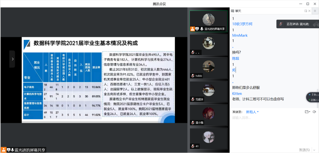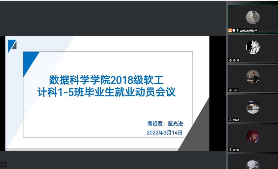 为更好适应当前严峻的就业形势,进一步实现我校2022届毕业生高质量就业目标,根据学校就业工作总体部署,在数据科学学院就业工作领导小组的统筹下,数学科学学院召开2022届毕业生新学期主题班会暨毕业班就业动员大会,数科院2022届全体毕业生802名学生通过线上方式参加。