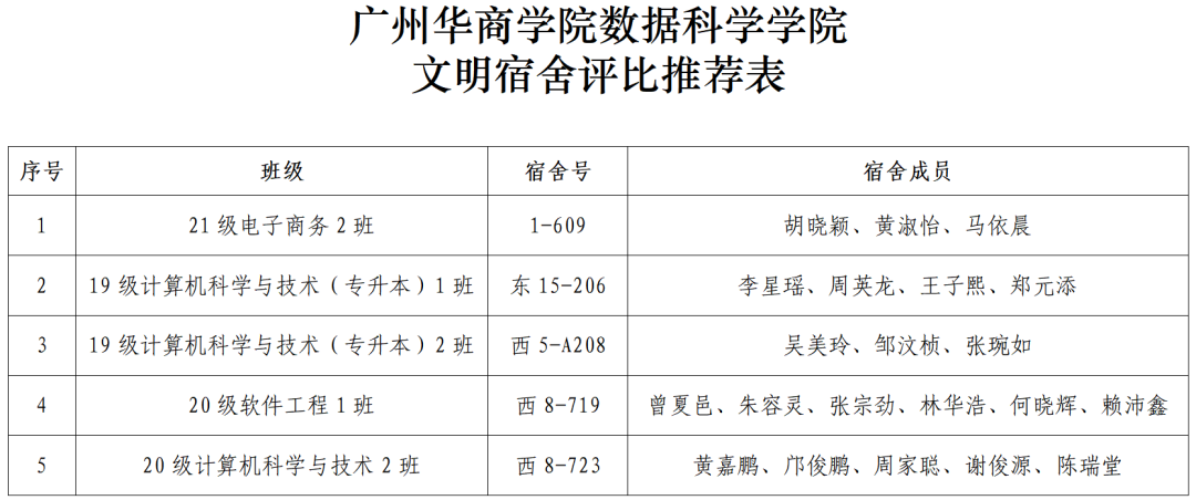 活动开展中,我院涌现出一批干净整洁、舒适安全、舍风优良的典型宿舍,为表彰先进,树立典范,通过自主报名、实地督查、量化考核等程序,经学院研究决定,拟推荐四会校区1-609、增城校区东15-206等5间宿舍参评学校“文明宿舍”称号,现将具体名单公示如下: