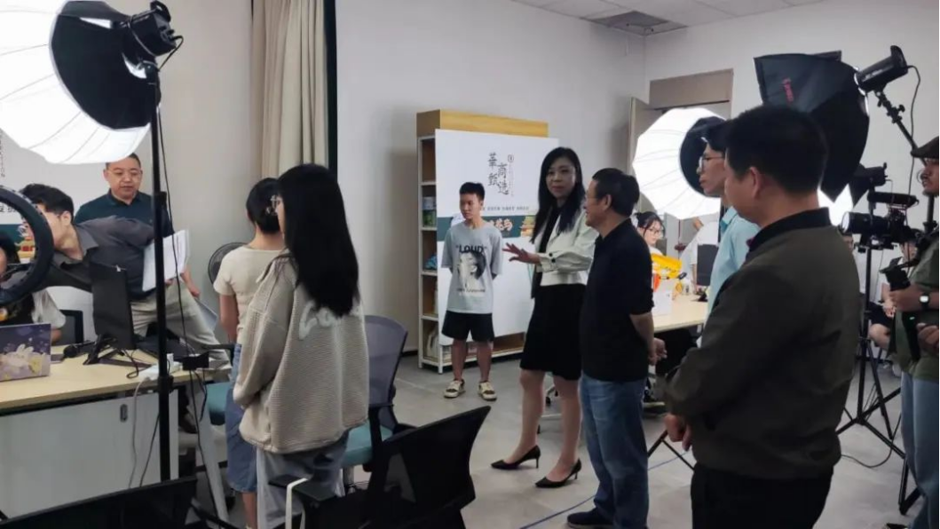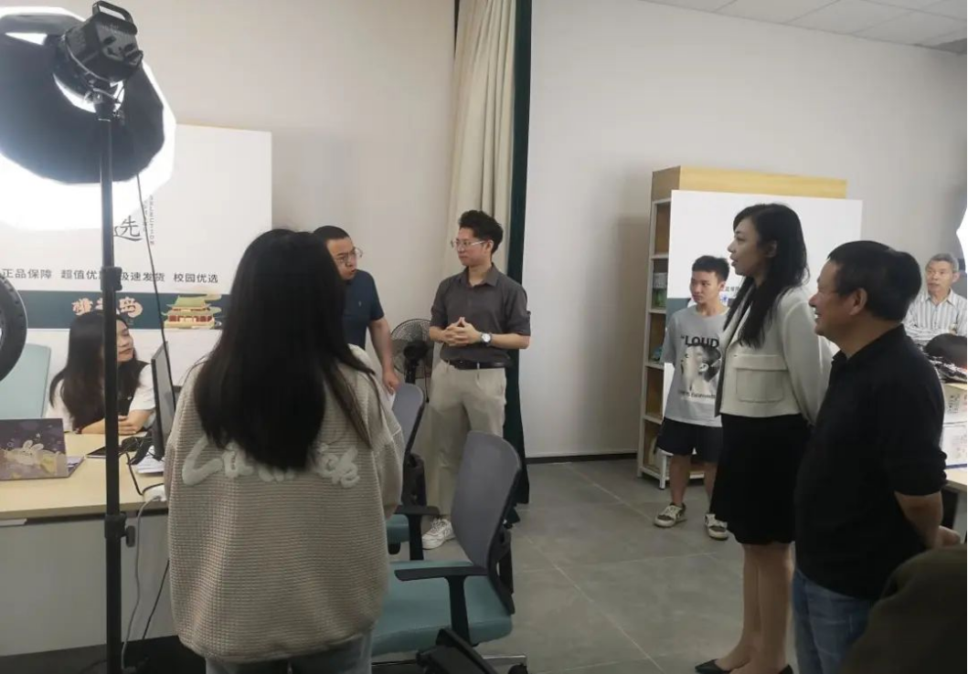 在试播现场,廖校长认真观摩了同学们的试播过程,询问同学们实训开展情况,现场参与同学们直播互动交流,并对同学们的表现给予了高度评价。