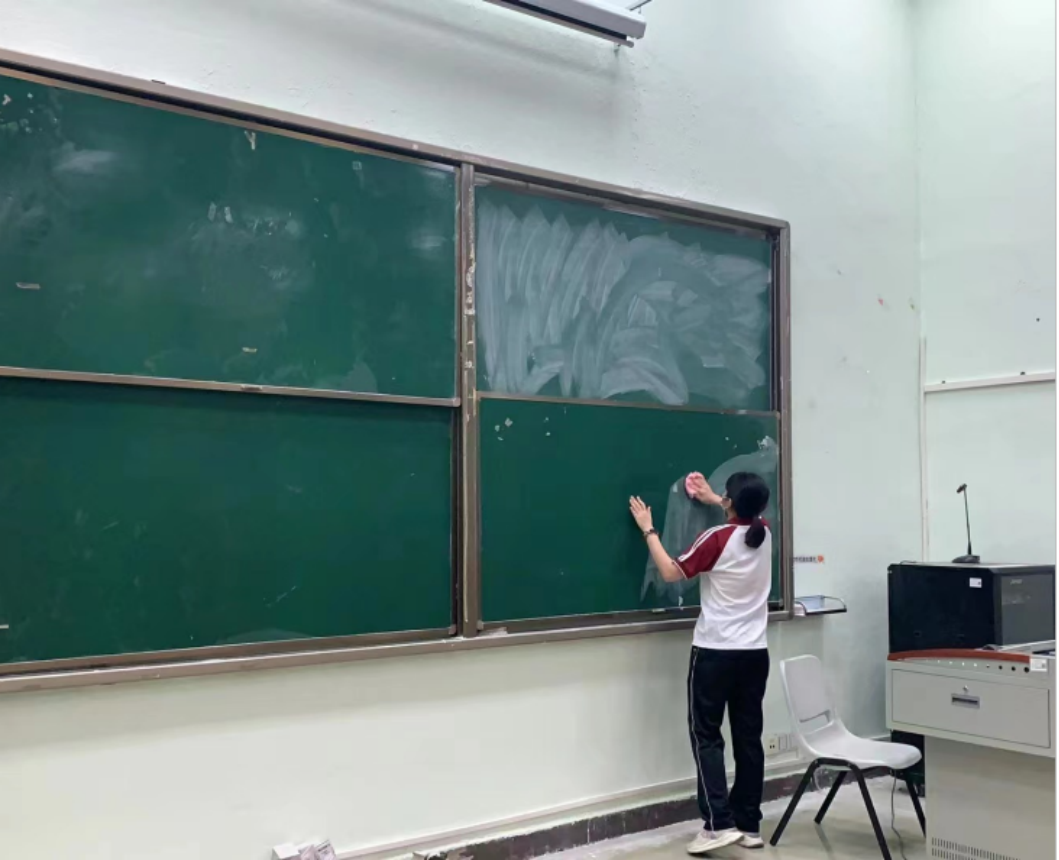 在活动中,青年志愿者秉持着不怕脏、不怕累的精神,用积极负责的态度认真细致地清理教室课桌和地板上的垃圾,用干净的抹布擦拭黑板。