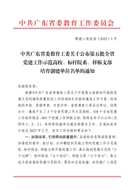 近日,中共广东省委教育工委公布了《第五批全省党建工作示范高校、标杆院系、样板支部培育创建单位名单》,伟德国际1946党委成功入选第五批“全省党建工作标杆院系”培育创建单位!这是对我校党建工作的高度肯定,也是伟德国际1946党委在党建工作中取得的又一重要成果。