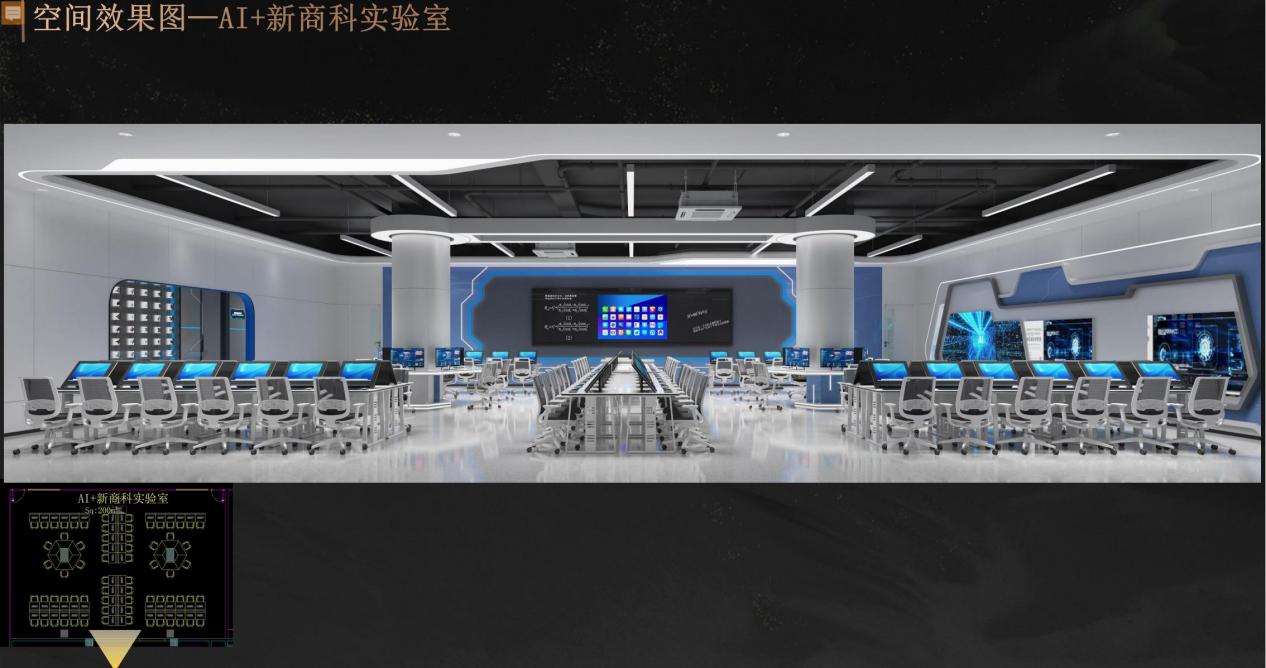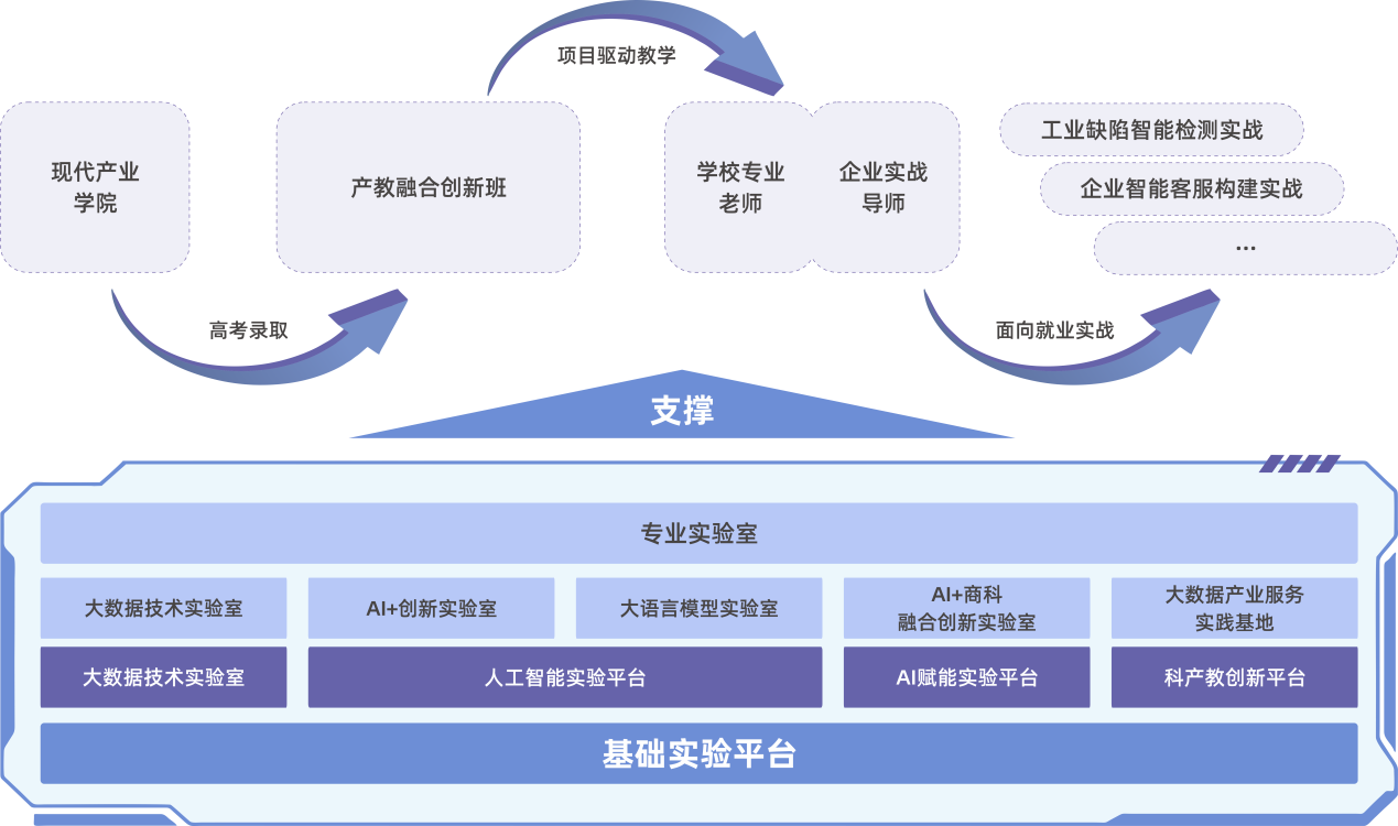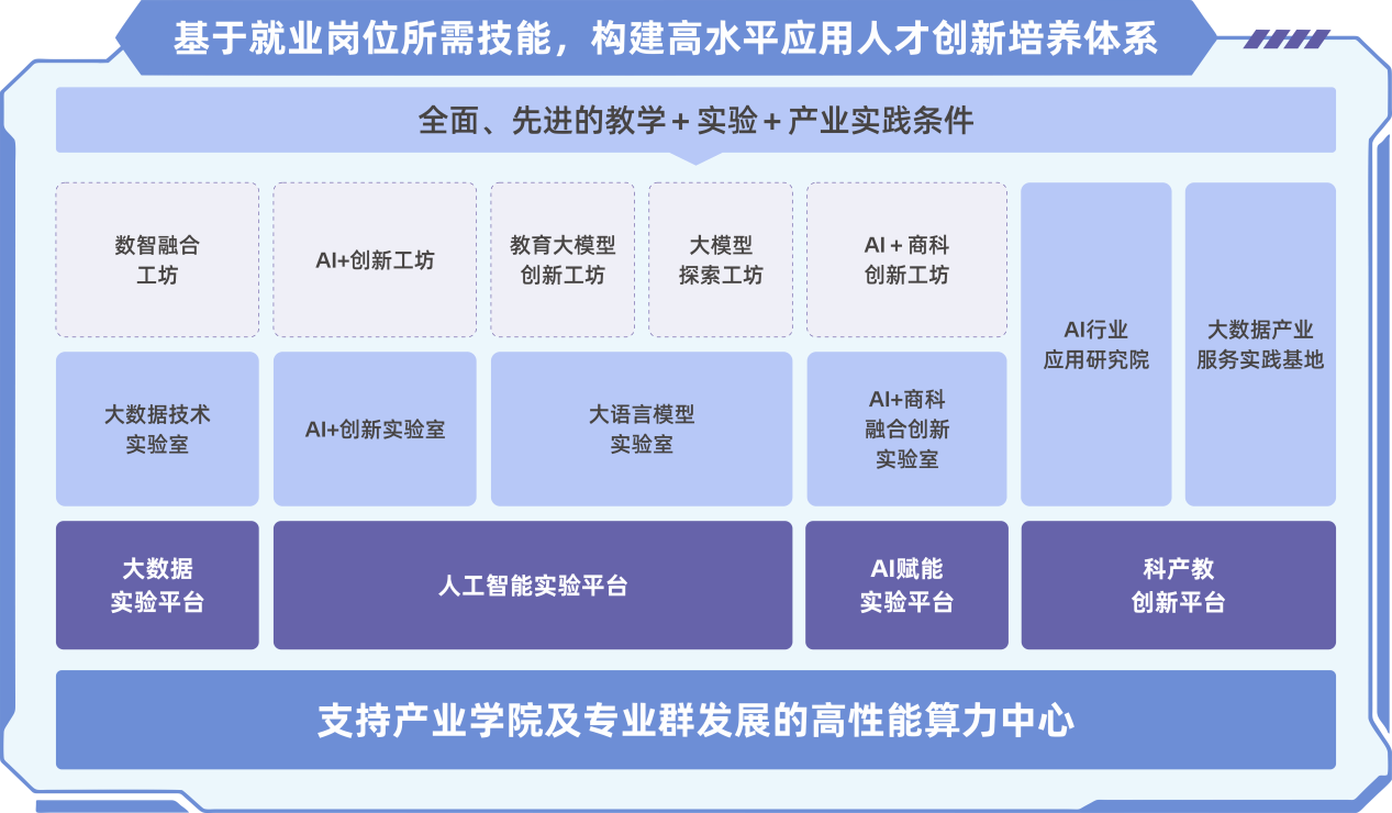 产业学院构建"基础实验-应用实战-产业服务"三级递进式实践教学体系,配备国际一流的算力资源、功能完备的教学实验平台、源自产业一线的AI与大数据课程资源,以及文心一言、DeepSeek等大语言模型的开发平台与私有化部署环境。通过整合国家级A类赛事专用设备、多场景专业教学仪器等资源,AI+创新实验室与AI+商科融合创新实验室提供跨行业应用场景实践案例及专业设备支持;大语言模型实验室则配备企业级全功能开发平台,支持大模型微调训练等产业级应用。由此形成的算力资源、产业课程、企业级开发平台、赛事支撑"四位一体"实验环境,使产业学院整体实验条件达到国内应用型本科院校领先水平。
