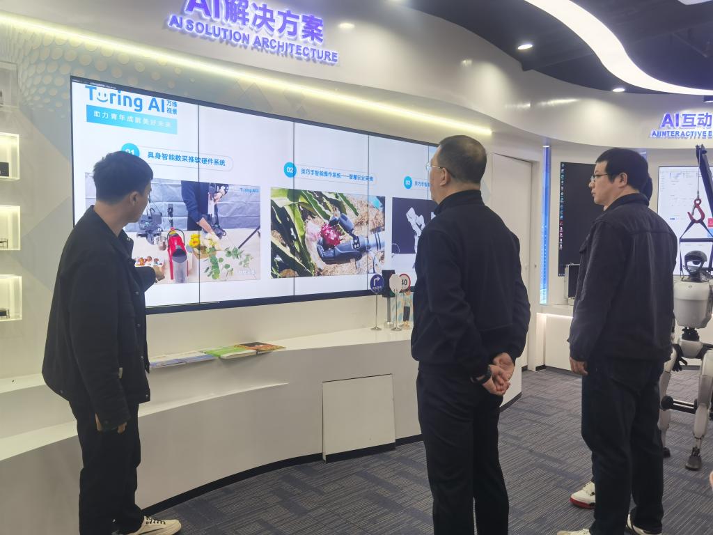 在业务经理张曼的引导下,吕峻闽副校长一行先后参观了公司旗下课程教学平台、人工智能训练平台及产教融合平台。实地了解了 Turing AI 大模型赋能下的具身智能仿真系统、myArm M&C 系列机器人技能训练模块等核心教学与实训资源,近距离观摩了 AI 互动体验、机器人实操训练等场景,对企业在人工智能教育软硬件一体化建设、产教融合生态构建方面的创新实践给予高度评价。特别是企业聚焦青年成长需求,将前沿技术与教学实践深度结合的理念,与学校培养应用型人才的目标高度契合。