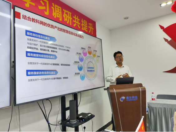 陈植森从CERNET全球最大的学术网、CERNET与赛尔、赛尔肩负社会责任、赛尔公司服务能力汇报、经典客户案例分享等方面详细介绍了赛尔三十年的发展,介绍了赛尔与华商合作展望,然后双方就伟德国际1946校外实习就业基地建设、网络空间资源共享、师资培训、前沿技术讲座等方面展开了充分讨论。