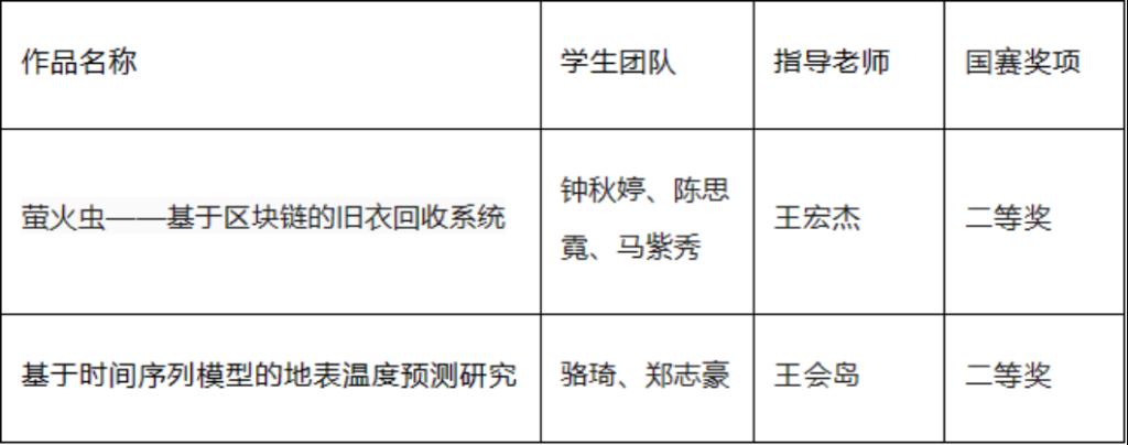 激情飞扬的7-8月,第十六届中国大学生计算机设计大赛全国总决赛暑假期间在不同赛区进行着激烈的角逐并落下帷幕。我院钟秋婷、陈思霓、马紫秀团队的参赛作品《萤火虫——基于区块链的旧衣回收系统》荣获软件应用与开发类全国二等奖;骆琦、郑志豪团队的参赛作品《基于时间序列模型的地表温度预测研究》荣获大数据应用类全国二等奖。