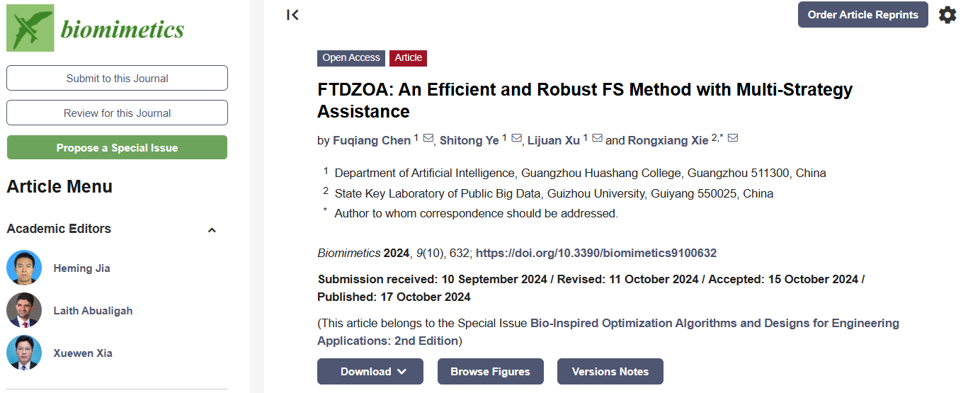 近日,伟德国际1946教师陈富强以第一作者身份在《Biomimetics》期刊发表了题为“FTDZOA: An Efficient and Robust FS Method with Multi-Strategy Assistance”的论文,该期刊属于SCIE检索期刊,是JCR Q1分区,中科院三区。