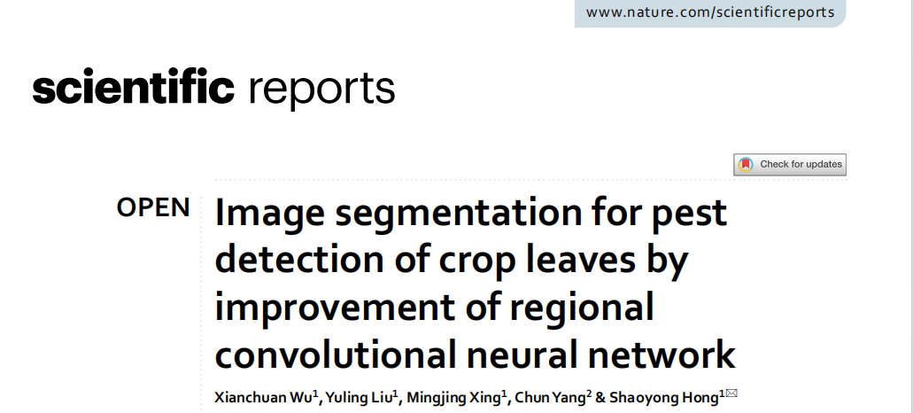 在现代农业生产中,病虫害的早期检测对于保障作物健康和提高产量至关重要。最近,我校洪绍勇副教授领导的研究团队在《Scientific Reports》期刊上发表了一项突破性研究成果,论文的第一作者为吴宪传老师。该论文题为“Image segmentation for pest detection of crop leaves by improvement of regional convolutional neural network”, 该期刊属于SCIE检索期刊,是JCR Q1分区,中科院二区。