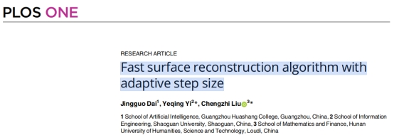 2025年1月,人工智能学院戴经国教授以第一作者身份在《PLOS ONE》期刊发表了题为“Fast surface reconstruction algorithm with adaptive step size”的论文。该期刊是SCI收录期刊,是JCR Q1分区,中科院三区。PLOS ONE是由Public Library of Science(PLOS)创办的一本综合性期刊,创刊于2006年,该期刊致力于推动科学研究的开放与共享,为全球学术界提供一个无国界、无障碍的科学交流平台。