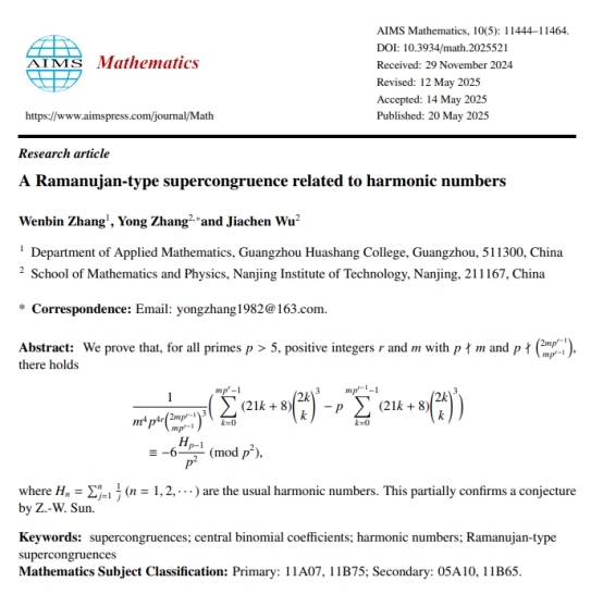 近日,伟德国际1946张文彬在期刊《AIMS Mathematics》(SCIE检索,JCRQ1,中科院三区)发表了题为《A Ramanujan-type supercongruence related to harmonic numbers》的研究论文。该论文研究与调和数相关的超同余式问题,部分证实了孙智伟教授提出的一个拉马努金型的超同余式猜想,为该猜想的彻底解决提供了一种理论支撑。